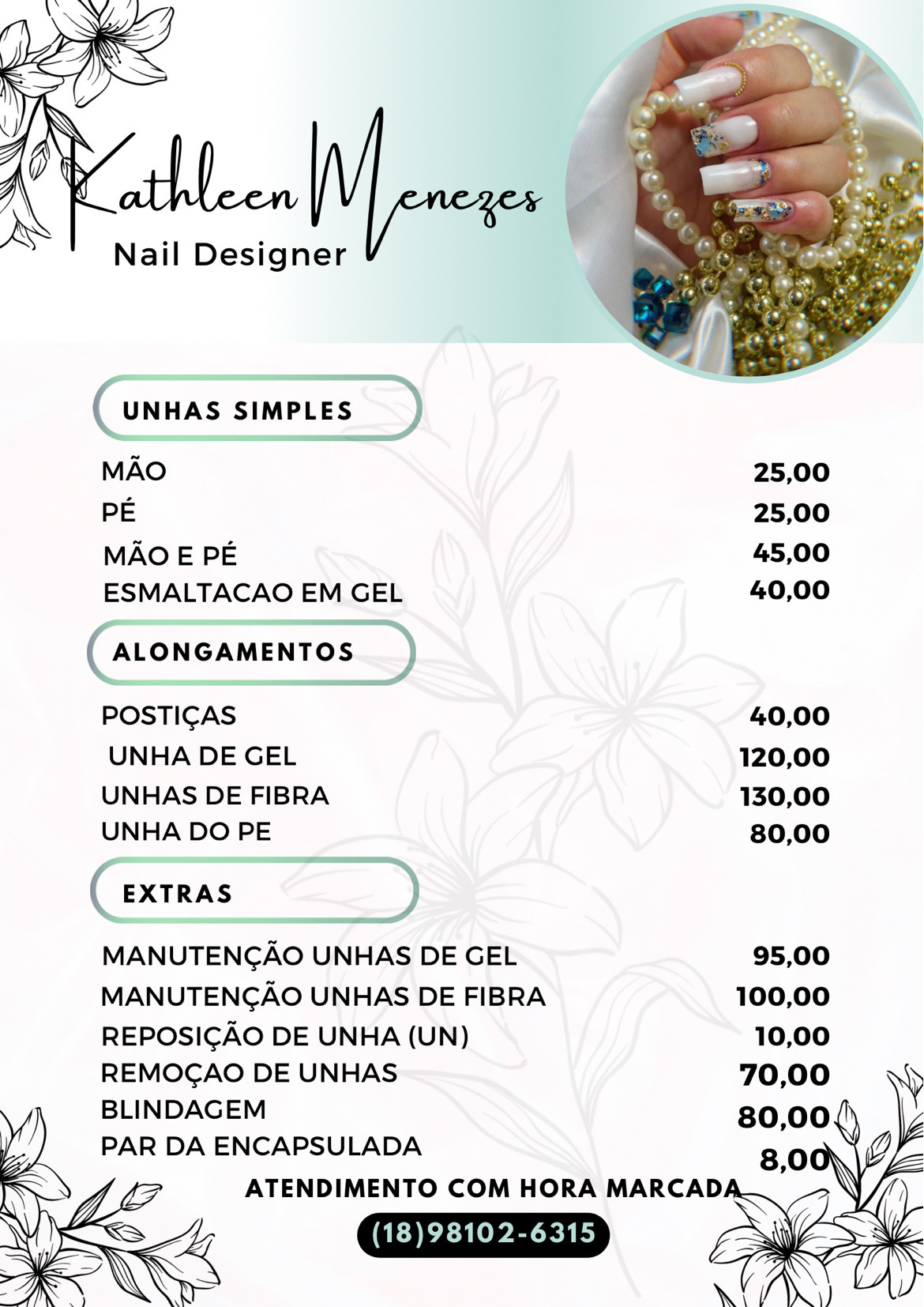 Sou uma profissional dedicada ao embelezamento, oferecendo serviços como pé e mão tradicional, esmaltação em gel, blindagem, alongamento de fibra de vidro, alongamento de gel e unhas postiças. 💅✨
